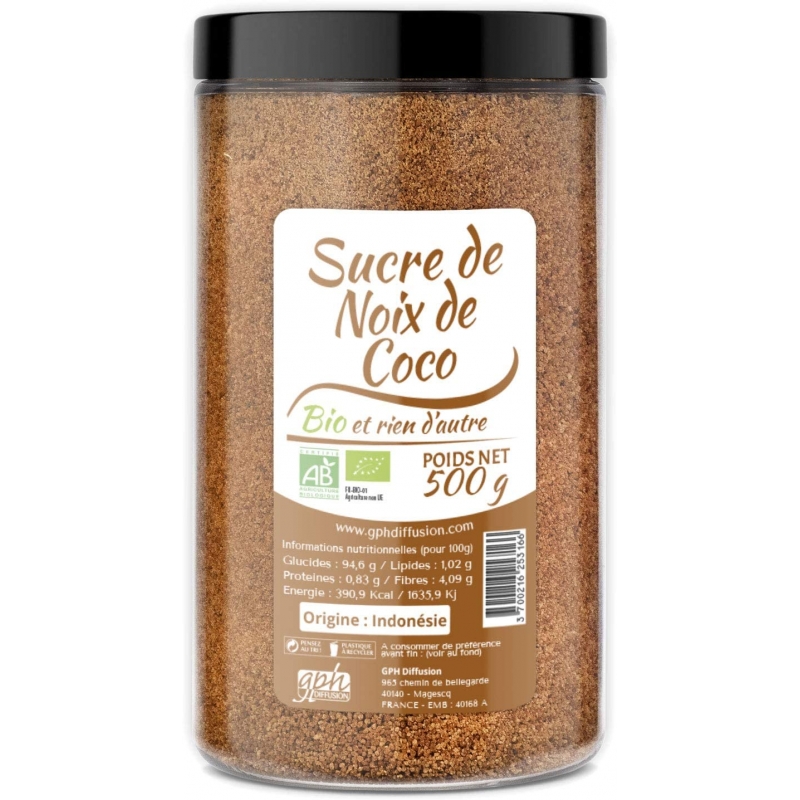 | Présentation | Au même titre que le sucre de bouleau, le miel ou le sirop d’agave, le sucre de coco est un édulcorant naturel qui peut remplacer le sucre raffiné. Semblable au sucre roux, il possède cependant un goût différent, bien plus caramélisé. Le sucre de coco peut s’utiliser dans un yaourt, un thé ou un café ou pour sucrer légèrement un délicieux smoothie au fruits frais. Ce sucre naturel peut également être une bonne alternative au sucre blanc dans de nombreuses recettes.Le sucre de coco est un sucre non raffiné fabriqué à partir des fleurs du cocotier. Le nectar de coco est récolté sur les inflorescences, c’est un liquide épais de couleur brune qui fait penser à du miel. Pour une utilisation pratique en cuisine, le nectar, également appelé toddy, est transformé en sucre cristallisé non raffiné. Le liquide est tout d’abord chauffé afin d’enlever la majorité de l’eau qu’il contient. On obtient alors un bloc plus ou moins moelleux qui est séché puis frotté afin d’obtenir un sucre en cristaux. Quant à la sève fermentée, elle est utilisée pour la fabrication de vinaigre et de vin de coco.Conditionnement : pot de 500 g nets |