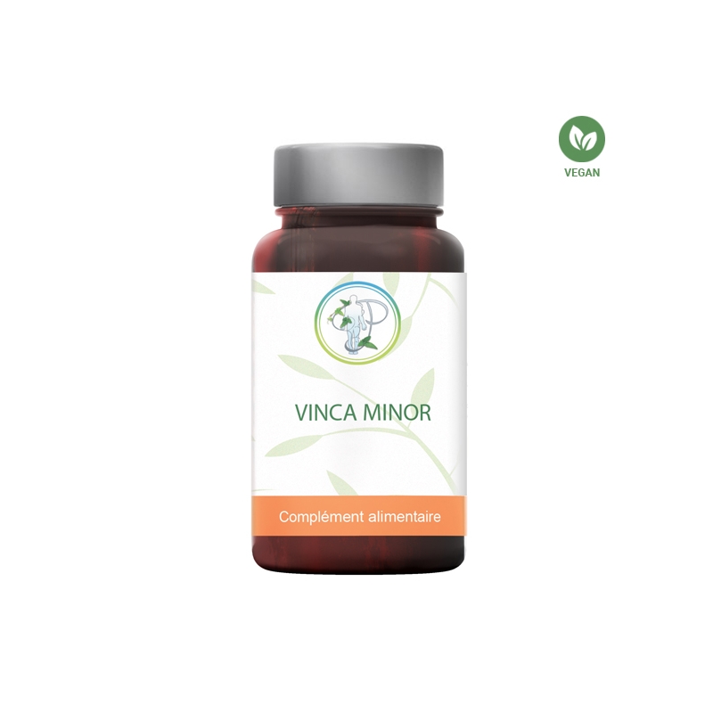 | Composition | Ingrédients pour 3 gélules : 900 mg d’extrait de Vinca Minor ratio 4/1, farine de riz, gélule végétale Pullulan Pot de 90 gélules pour un traitement d'un mois environ. Poids net : 36 g |