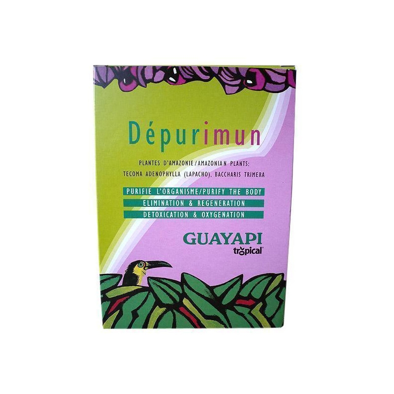 | Action | Purifie et contribue à détoxifier l'organisme - Elimination et régénérationLe complexe Depurimun Guayapi permet de désencombrer, de décharger le corps des toxines et d’augmenter ainsi les défenses naturelles de l’organisme. Idéal aux changements de saisons. L’élimination des toxines, provoque un regain d’énergie et permet à l’organisme de mieux assimiler les nutriments, les vitamines, lui permettant ainsi de profiter pleinement du changement de saison. |