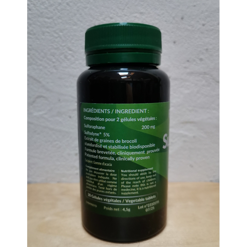| Informations diverses | Le sulforaphane est un composé organosulfuré que l’on trouve dans les crucifères, comme le brocoli, le chou de Bruxelles ou les choux-fleurs. Il se forme lorsque son précurseur, la glucoraphanine est hydrolysée par une enzyme nommée myrosinase.Ses bienfaits reposent sur 3 mécanismes d’actions : Activité antioxydante, Activité anti-inflammatoire, Protection cellulaire (le sulforaphane est une molécule dite épigénétique). Consommer du brocoli n’apporte pas forcément la dose efficace en sulforaphane pour agir sur la santé. Effectivement, la quantité de sulforaphane ingérée dépend de plusieurs critères tels que la qualité du brocoli et ses conditions de stockage, le type de cuisson, ou encore la capacité de la flore intestinale – qui est spécifique à chaque individu à hydrolyser la glucoraphanine. |