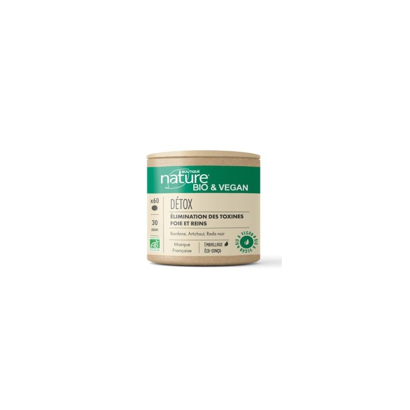 | Informations diverses | Informations nutritionnelles : Pour 2 comprimés : Equivalent plante sèche : Extrait de bardane…………………..240 mg 1 200 mg Extrait d’artichaut …………………..300 mg 600 mg Poudre de radis noir ………...……..180 mgConditionnement : 60 comprimésEmballage Eco-conçu : - pilulier en carton recyclé et recyclable - couvercle en matière biosourcée - étiquette à base de fibres végétales |