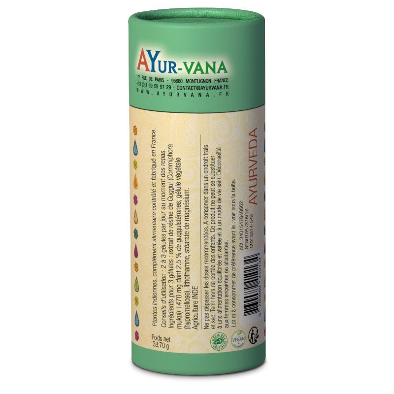 CompositionPour 3 gélules : extrait de résine de Guggul (Commiphora mukul) 1470 mg titré à 2,5 % de guggulstérones, gélule végétale (hypromellose), lithothamne, stéarate de magnésium.