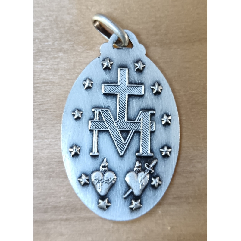 | Présentation | Cette médaille représentant la Vierge Miraculeuse doit son origine aux apparitions mariales qui ont eu lieu dans la Chapelle de la rue du Bac et notamment en 1830 devant Catherine Labouré. La Vierge apparaît debout sur le monde écrasant de son pied le mal représenté par un serpent. Cette médaille ovale en argent - qui compte 2 faces - porte d'un côté quelques mots de prière et de l'autre le "M" de Marie chapeauté d’une croix et entouré de 12 étoiles, évoquant le pouvoir divin sur la création. On retrouve également deux cœurs, celui de Jésus et de Marie symbolisant l’amour divin envers les hommes. Cette médaille porte en elle un vrai message de protection et la volonté de remettre l’enfant qui la portera sous la bénédiction de la Vierge.Dimensions : hauteur 3,5 cm ; largeur : 2,1 cm Poids : 11 g |