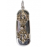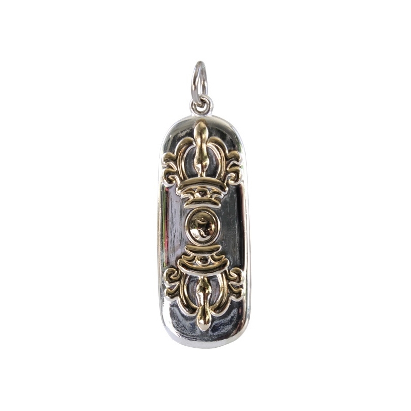 | Présentation | La médaille Om est associée aux doubles poissons qui apportent la chance, la richesse, la fécondité. Dans l'iconographie chrétienne, le poisson a fait l'objet d'un certain nombre d'interprétations. Le monosyllabe Om est le symbole le plus chargé de sens de la tradition hindoue. Il est le son primordial inaudible, le son créateur à partir duquel se développe la manifestation, l'image donc du Verbe. Il est l'impérissable, l'inépuisable (akshara) ; il est l'essence même des Vedas, et donc de la science traditionnelle. Il est le symbole de Ganesha et correspond au Swastika emblème du développement cyclique de la manifestation, à partir du centre primordial immuable. |
