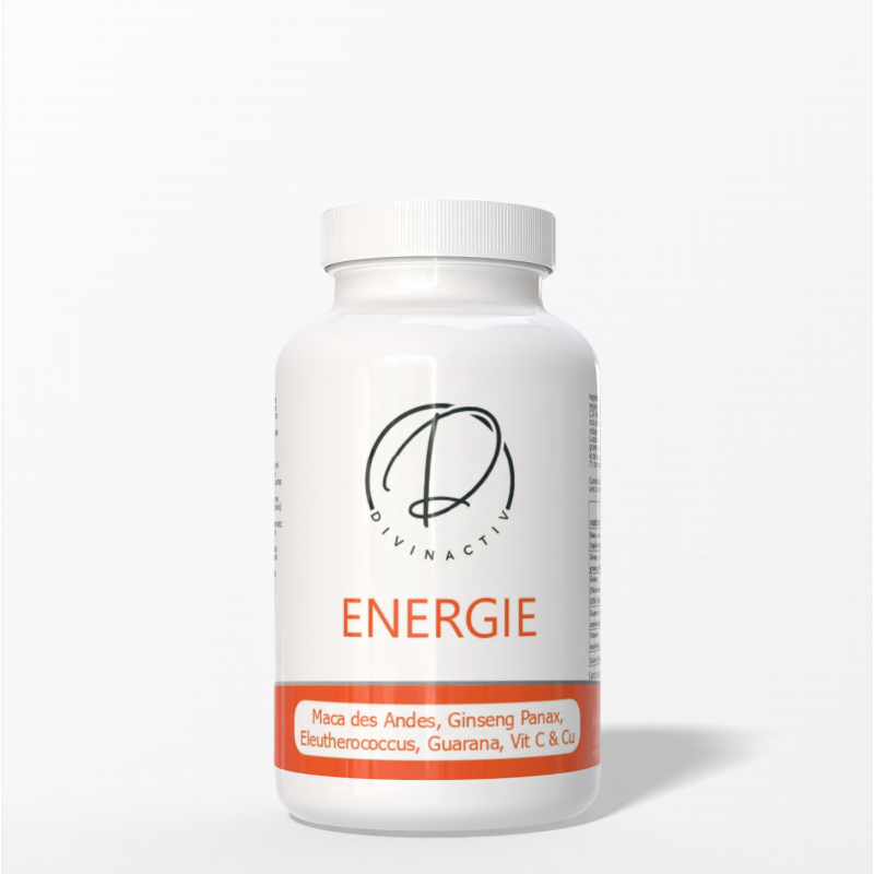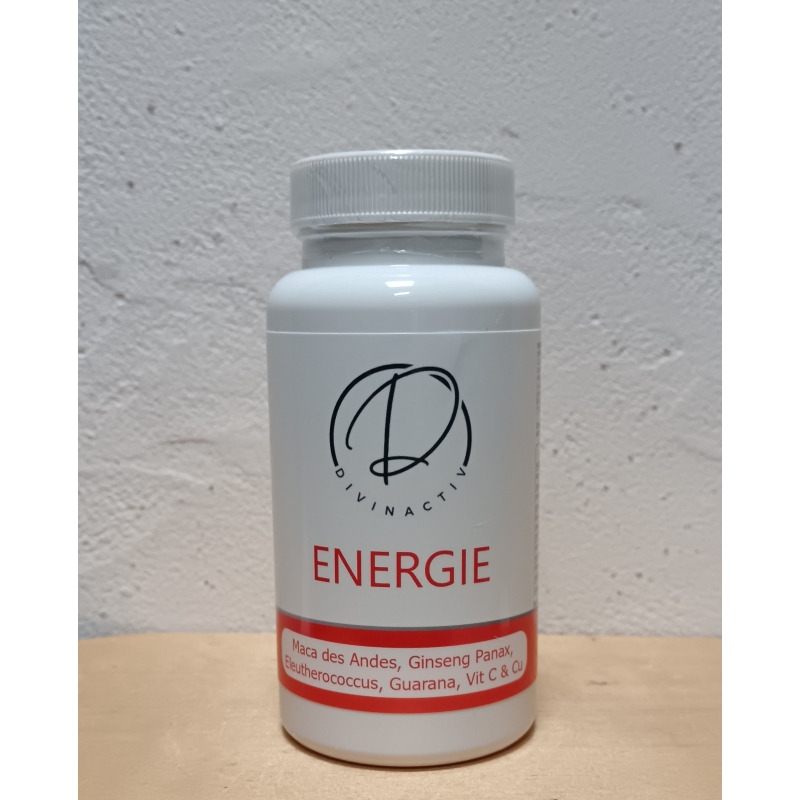 | Présentation | Grâce à la combinaison de ces 5 actifs ; Guarana, Maca, Ginseng, Eleutherocoque et Cuivre, vous retrouverez votre niveau d’énergie en cas de fatigue passagère. Par exemple lors des changements de saison, si vous ressentez une baisse de tonus, vous pouvez être sûr que cette formule ENERGIE vous aidera à retrouver votre tonus !Pot de 60 gélules végétales pour un traitement de 30 jours Poids net : 30,95 g |