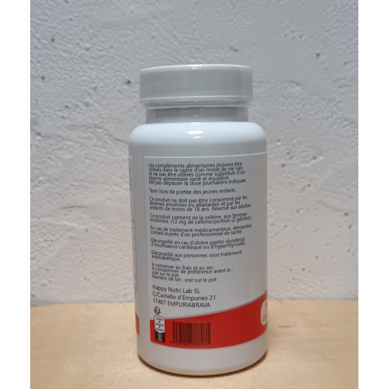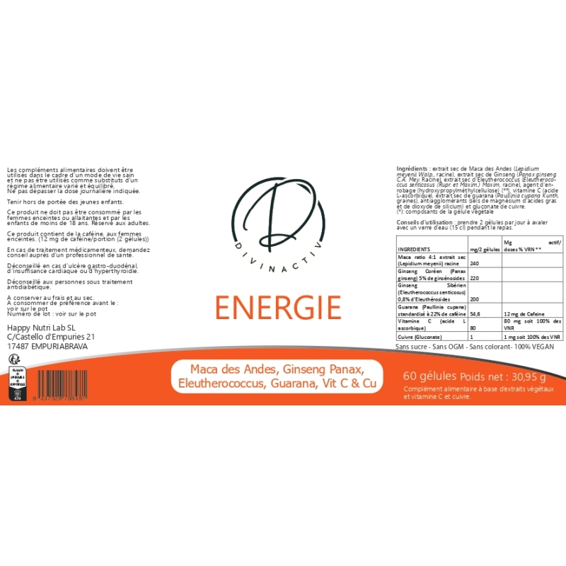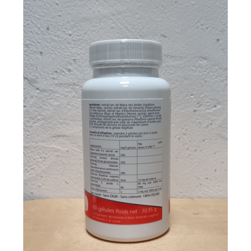 | Composition | Composition pour 2 gélules : - Maca des Andes (Lepidium meyenii Walp., racine) – ratio 4:1 extrait sec : 240 mg ;- Ginseng Coréen (Panax ginseng C.A. Mey. Racine) – Extrait sec standardisé, 5% de ginsénosides: 220 mg ;- Ginseng Sibérien (Eleutherococcus senticosus, racine) – Extrait sec standardisé à 0,8% d’Eleuthérosides : 200 mg ;- Vitamine C (acide L ascorbique) – 80 mg soit 100% des VNR** : 80 mg ;- Guarana (Paullinia cupana) graine – Extrait sec standardisé à 22% de caféine – 12 mg de caféine : 54.60 mg ;- Cuivre (Gluconate) – 1 mg soit 100% des VNR** : 1 mg ;- Gélule végétale HPMC (*) : sels de magnésium d’acides gras et de dioxyde de silicium.(*) composant de la gélule végétale(**) Valeur nutritionnelle de référence |