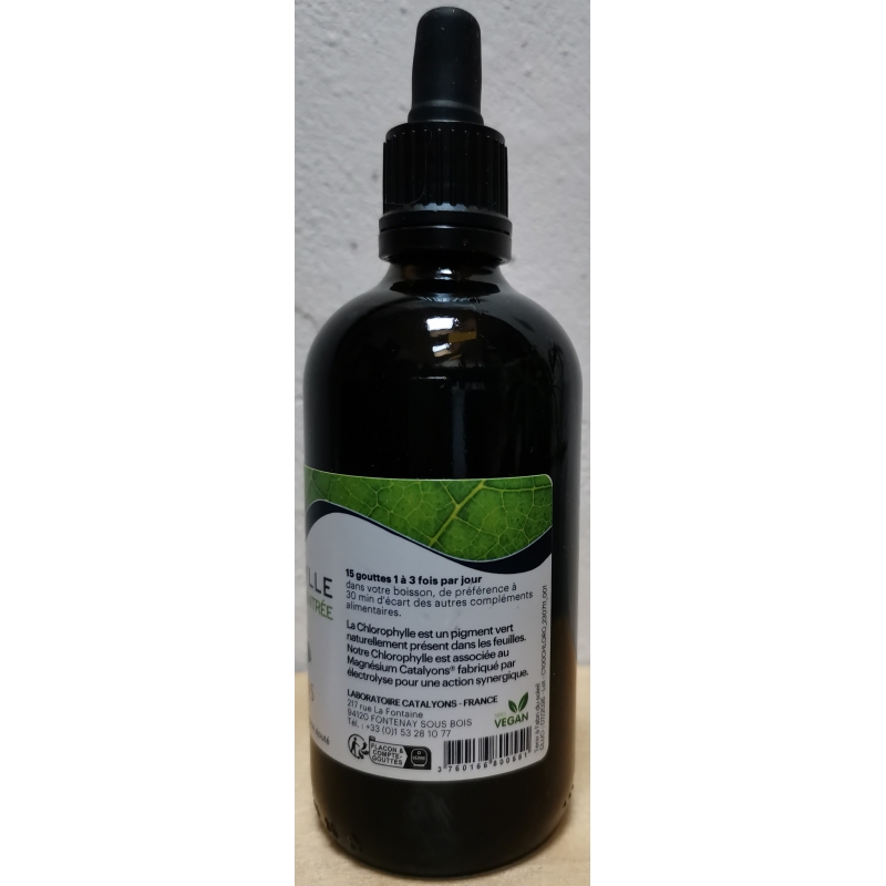 Présentation | QU’EST-CE QUE LA CHLOROPHYLLE ? La Chlorophylle vient du grec khloros : vert et phullon : feuille. C’est le pigment vert des feuilles. Elle est à l’origine de la photosynthèse en transformant l’énergie solaire en énergie chimique. La photosynthèse permet aux plantes de produire du sucre à partir du CO2 et de l’eau. La chlorophylle peut être assimilée de par sa structure et son rôle à l’hémoglobine présente dans le sang humain. Ces deux pigments ont, en effet, la même fonction de transporteur d’oxygène au sein de la plante et du corps. C’est la porphyrine qui confère à la chlorophylle ce rôle dans la respiration cellulaire. La structure de la chlorophylle et de l’hémoglobine est similaire. L’hémoglobine possède un noyau de fer alors que le noyau de la chlorophylle est un magnésium. La similitude structurale et fonctionnelle de ces deux éléments explique pourquoi la chlorophylle est si facilement absorbée par le sang.Les différentes sources de chlorophylle sont la chlorella (algue), la luzerne et la spiruline.Cette chlorophylle est associée au magnésium Catalyons fabriqué par électrolyse pour une action synergique.Présenté en flacon de 100 ml équivalant à 2000 doses et 133 doses |
