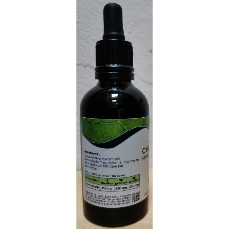 | Composition | Ingrédients : Eau purifiée et dynamisée, chlorophylle magnésienne, hydroxyde de magnésium fabriqué par électrolyse |