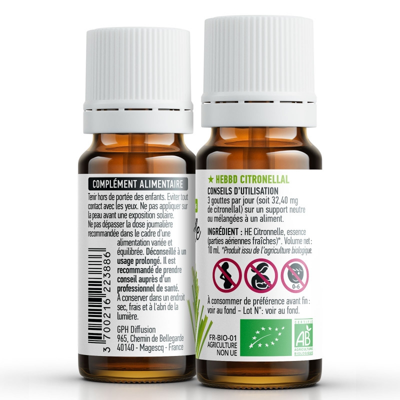 Présentation | Cette huile essentielle de citronnelle est obtenue par distillation des feuilles fraîches. Elle est certifiée bio et possède les labels AB et Eurofeuille. Elle sont également HEBBD (Huile Essentielle Botaniquement et Biochimiquement Définie) et HECT (Huile Essentielle Chémotypée). Son identification botanique et biochimique est ainsi garantie, pour une huile de haute qualité.Bien qu'elle soit représentative des saveurs de l'Asie, la citronnelle est utilisée traditionnellement au nord du Maroc, pour donner une nouvelle saveur au thé vert à la menthe. D'ailleurs, ses feuilles séchées sont utilisées depuis de nombreuses années dans de multiples recettes. C'est une plante qui est souvent associée au gingembre, à la noix de coco, au piment, à l'ail et à l'échalotte.Disponible en 3 formats : 10 ml, 30 ml, 50 ml |
