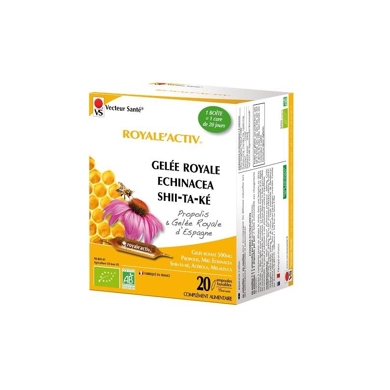 Royal'Activ, une composition en BIO Unique exceptionnelle : Echinacéa + Gelée Royale + Propolis + Shiitaké + Acérola + HE de Tea Tree et jus de citron