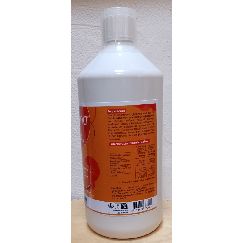 CompositionListe des ingrédients : Eau déminéralisée, glycérine, exsudat de pousses de Bambou (Bambusa arundinacea) titré en Silice, extrait de rhizome de curcuma à 95% curcuminoïdes, extrait de poivre noir 7% pipérine, sulfate de cuivre, arôme naturel orange, acidifiant : acide citrique, conservateur : sorbate de potassium.
