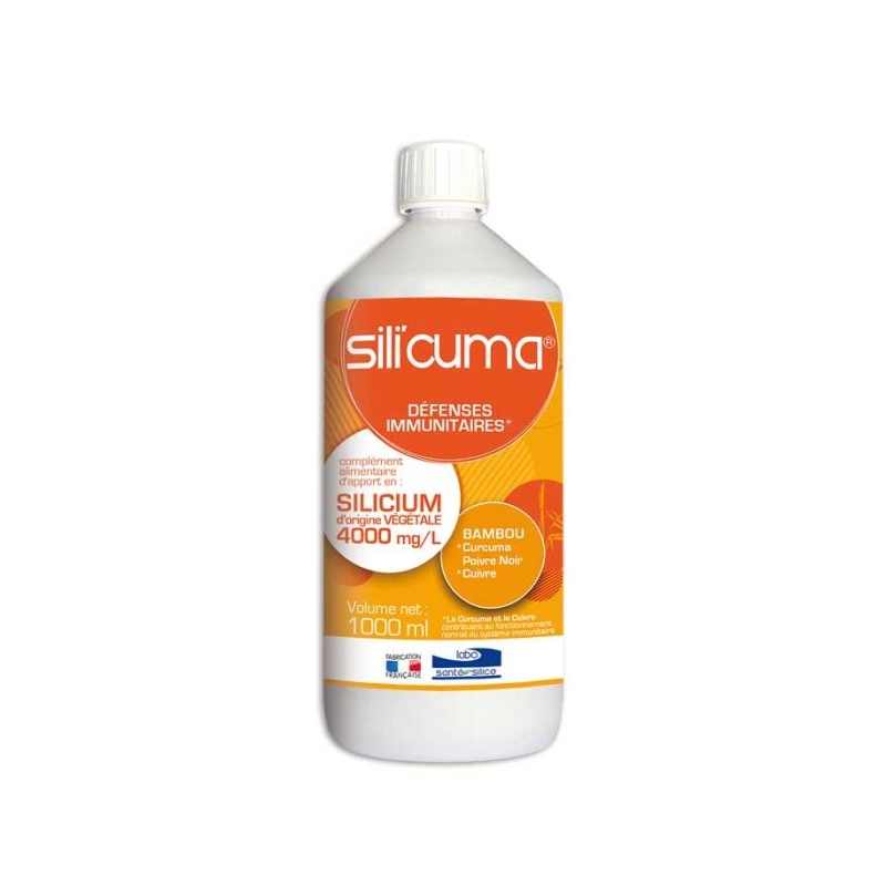 PrésentationSILI'CUMA® DÉFENSE IMMUNITAIRE est un complément alimentaire essentiel pour le soutien du système immunitaire. Cette formule unique, composée de Silicium d'origine végétale, de Curcuma, de Poivre noir et de Cuivre, contribue au fonctionnement normal du système immunitaire.Le Silicium, extrait de l'exsudat de jeunes pousses de bambou, est un oligo-élément essentiel qui constitue un véritable réservoir en silicium. Il contribue non seulement au confort articulaire, mais aussi au bon fonctionnement du système immunitaire.Le Curcuma (Curcuma Longa) est une plante réputée pour maintenir le fonctionnement des articulations et des os. De plus, le Curcuma contribue également au fonctionnement normal du système immunitaire.Le Poivre noir est ajouté pour maximiser l'absorption des ingrédients actifs. Il potentialise le curcuma.Le Cuivre, enfin, est un minéral essentiel qui contribue au fonctionnement normal du système immunitaire.Ce complément alimentaire est présenté dans un flacon de 1000 ml, et il est formulé sans Benzoate de Sodium, sans Dioxyde de Silicium et sans Silicium de synthèse.SILI'CUMA® DÉFENSE IMMUNITAIRE a un excellent goût d'orange grâce à son arôme naturel.- Bambou Bio* (pousse) aide au confort articulaire, titré en silice à 180 mg pour 40 ml (2 bouchons de 20 ml) soit 62 mg de silicium.- Convient aux végétariens.