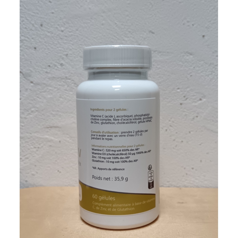 | Composition | Composition pour 2 gélules : -- Vitamine C (65% Acide L-Ascorbique 35% Complexe de phosphatidylcholine) – 520 mg soit 650% des AR* : 800 mg ; - Fibre d’acacia soluble : 116 mg ; - Picolinate de Zinc -10 mg de Zinc soit 100% des AR* : 46 mg ; - Vitamine D3 (Cholécalciférol) – 50 mcg soit 100% des AR* : 0.050 mg ; - Glutathion réduit : 10 mg ; - Gélule végétale Pullulane*(*) Composant de la gélule végétale (**) Apport de référenceNombre de doses : 60 gélules Durée du traitement pour 1 pot : 1 mois de traitement Poids net : 35,9 g |
