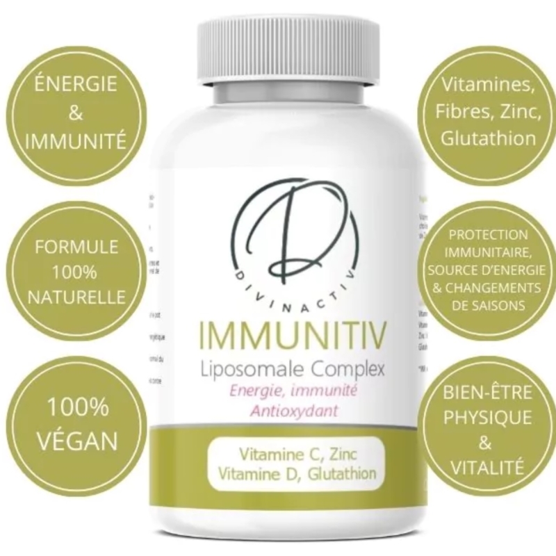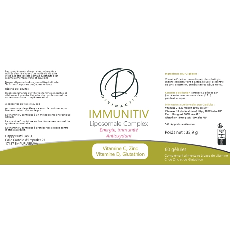 | Présentation | Complexe à base de vitamine C liposomale hautement biodisponible, avec du Zinc, de la vitamine D et du Glutathion pour booster la vitalité. |