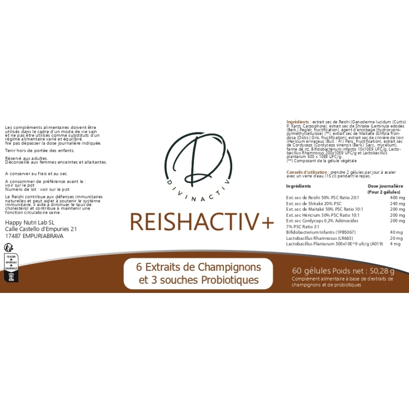 | Composition | Ingrédients pour 2 gélules : - Extrait sec de Reishi : 400 mg ; - Extrait sec de Shitaké (Lentinula edodes Berk Pegler) : 240 mg ; - Extrait sec de Maïtaké : 200 mg ; - Extrait sec de Héricium : 200 mg ; - Extrait sec de Cordyceps (dont 0,2% d'adénosides) : 200 mg ; - Bifidobacterium Infantis : 40 mg ; - Lactobacillus Rhamnosus : 20 mg ; - Lactobacillus Plantarum : 4 mg ; - Agent d'enrobage (hydroxypropylméthylcellulose) *(*) Composant de la gélule végétaleNombre de doses : 60 gélules Durée du traitement pour 1 pot : 1 mois de traitement Poids net : 50,28 g |