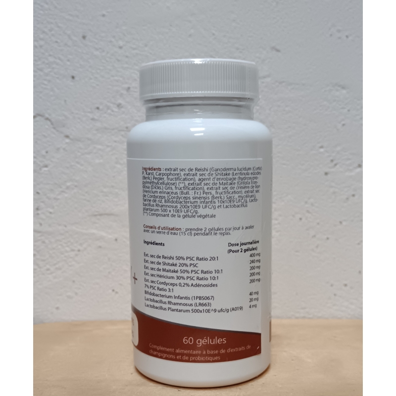 | Présentation | Complexe à base d'extraits de 6 champignons alliés à 3 souches de probiotiques. |