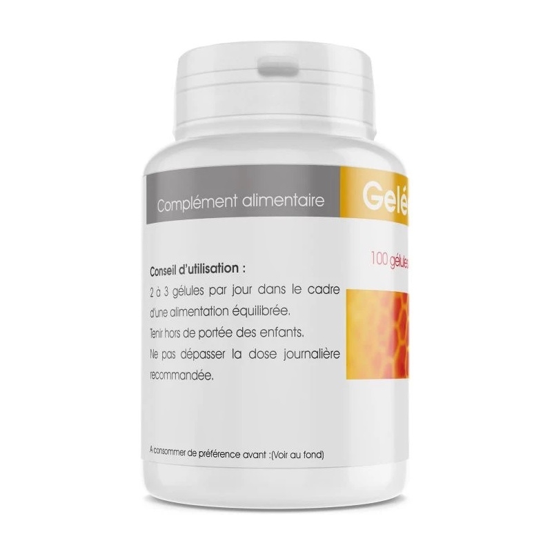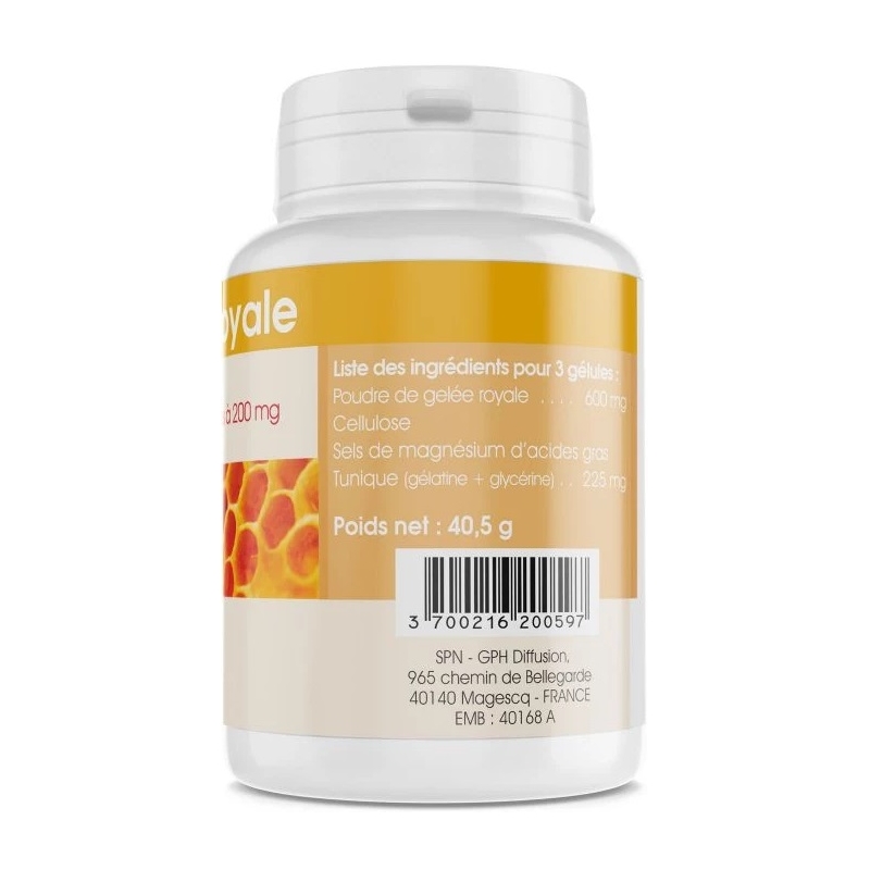 Pour 3 gélules : poudre de gelée royale 600 mg, gélule (gélatine et glycerine) 225 mg.