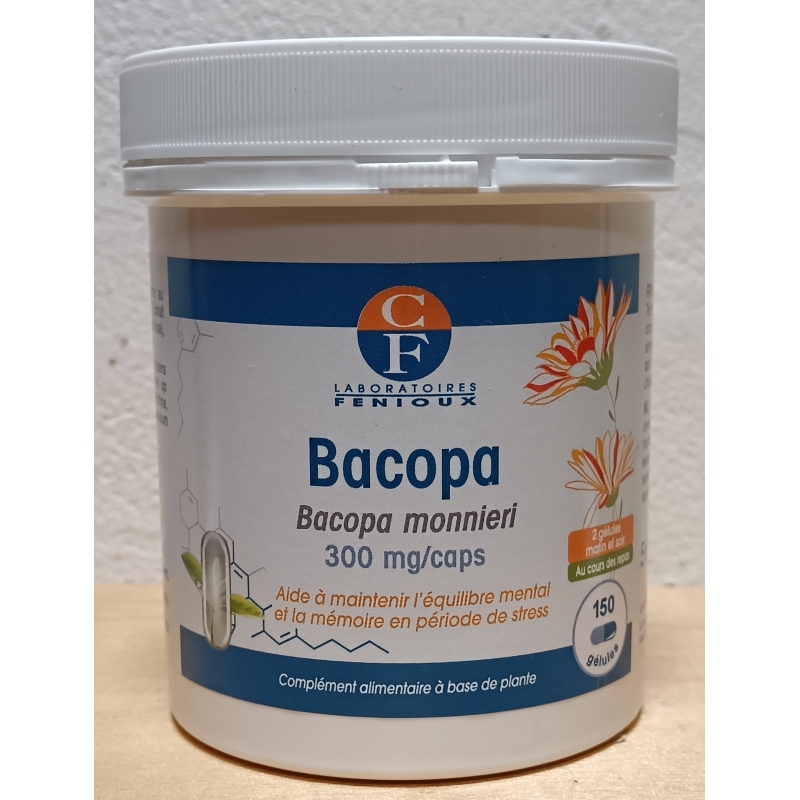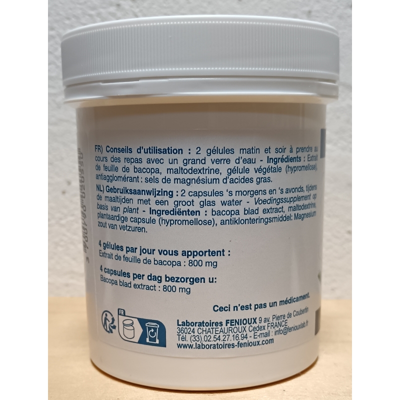| Composition | Extrait de Bacopa (Bacopa monnieri), Maltodextrine, Gélule d'origine végétale (hypromellose), Antiagglomérant : stéarate de magnésium |