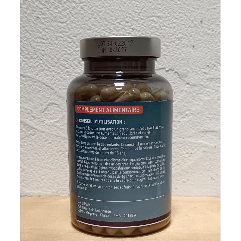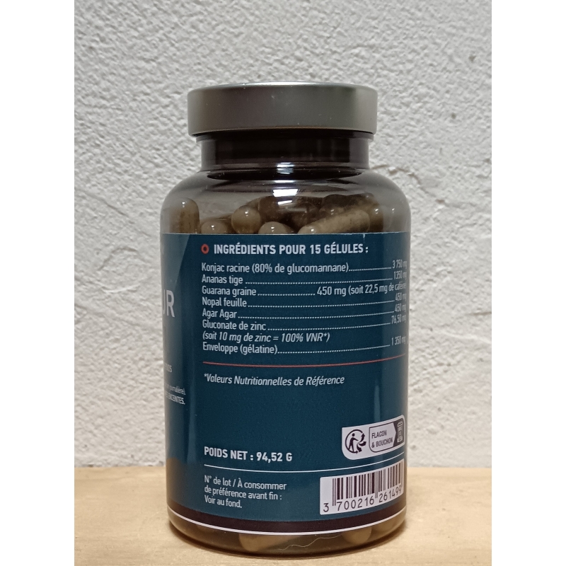 | Composition | Ingrédients pour 15 gélules :- Konjac rhizome (80% de glucomannane) : 3 750 mg ; - Ananas tige : 1350 mg ; - Guarana graine : 450 mg ; - Nopal feuille : 450 mg ; - Agar agar : 450 mg ; - Gluconate de zinc : 76,50 mg soit 10 mg de zinc (100% VNR) - Enveloppe (gélatine) : 1350 mgPoids net : 94,52 g Pilulier de 180 gélules |