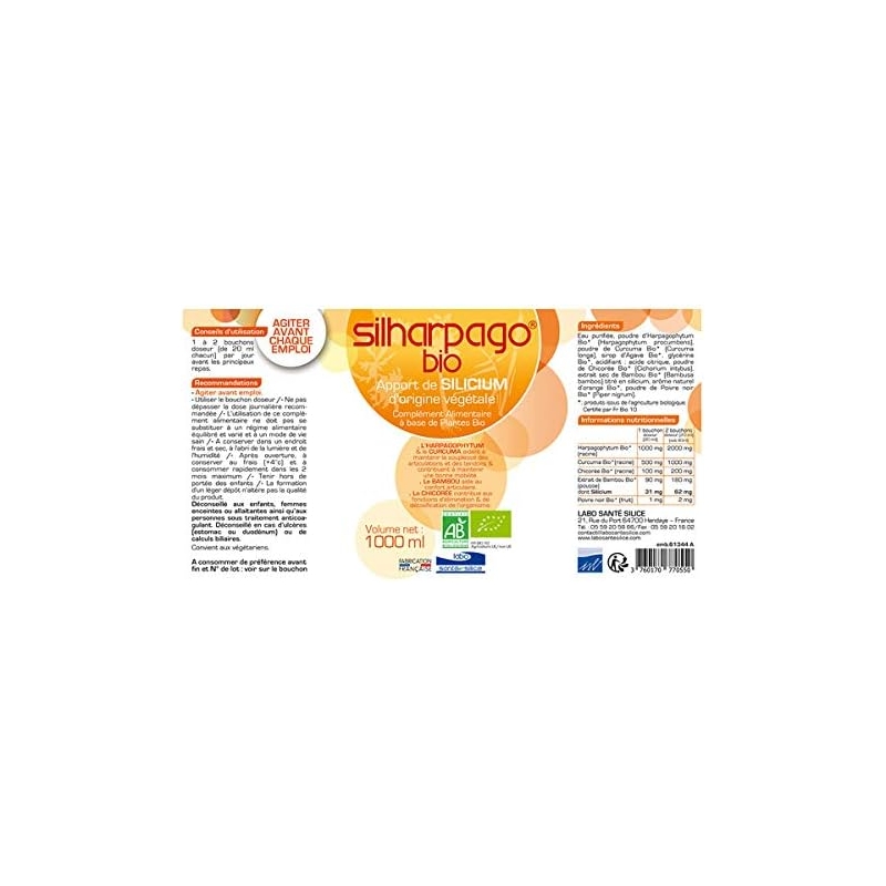 | Conseils d'utilisation | Bien agiter la bouteille avant chaque utilisation.2 bouchons de 20 ml apportent 2000 mg d'harpagophytum (racine) bio, 1000 mg de curcuma (racine) bio, 200 mg de chicorée (racine) bio, 180 mg d'extrait de bambou (pousse) bio donc : 62 mg de Silicium, 2 mg de poivre noir (fruit) bio.Suivant les besoins, 2 à 3 bouchons doseur par jour avant les repas. |