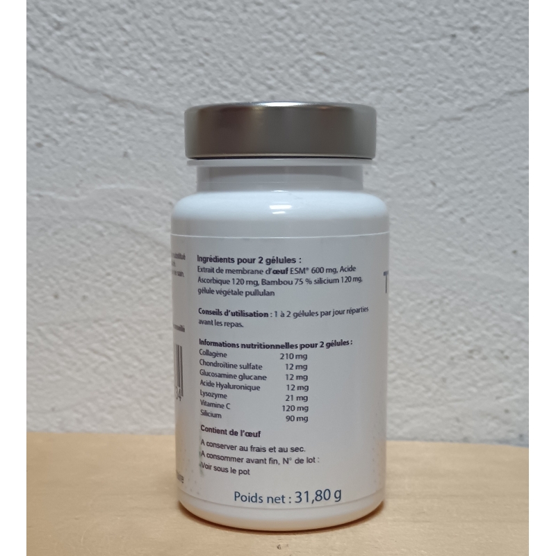 | Composition | Ingrédients pour 2 gélules : Extrait de membrane d’œuf ESM® 600 mg, Acide Ascorbique 120 mg, Bambou 75 % silicium 120 mg, gélule végétale pullulan Poids net : 31,80 g |