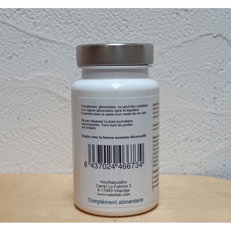 | Informations diverses | Informations nutritionnelles pour 2 gélules : Collagène 210 mg, Chondroïtine sulfate 12 mg, Glucosamine glucane 12 mg, Acide Hyaluronique 12 mg, Lysozyme 21 mg, Vitamine C 120 mg, Silicium 90 mg |