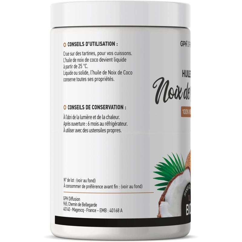 | Présentation | L'huile de noix de coco a de multiples usages : - en cuisine : comestible, elle résiste à des températures élevées sans être dénaturée, - en cosmétique : elle se prête à la réalisation de baumes, de crèmes corporelles, d'huile de massage car elle nourrit et hydrate la peauVolume net total : 1 litre |