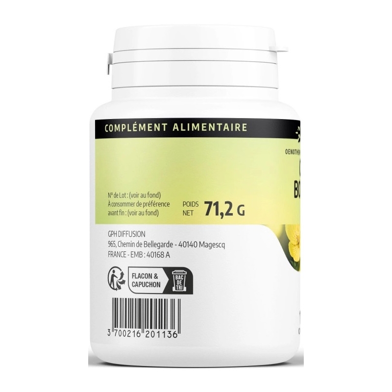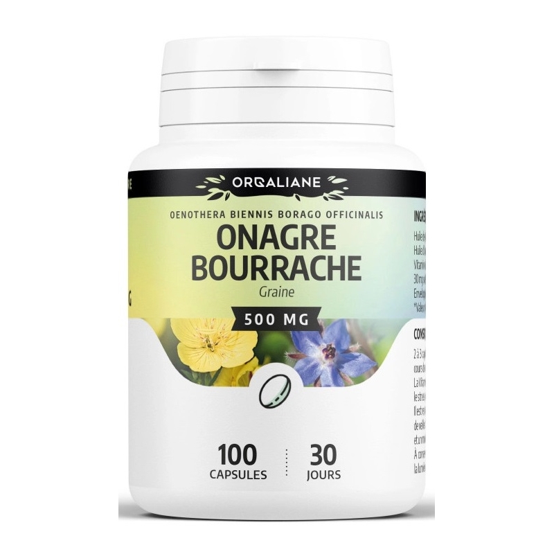 | Présentation | L'Onagre est une plante des régions tempérées originaire d'Amérique du Nord, reconnaissable par ses fleurs jaunes. Originaire du Pays du Soleil Levant, la Bourrache est répandue en Europe du Sud ainsi que sur le pourtour de la Méditerranée. Les huiles de Bourrache et d'Onagre sont obtenues par pression à froid. |