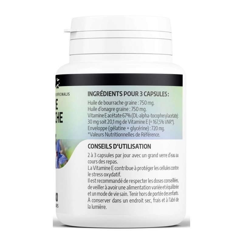 | Composition | Ingrédients pour une prise journalière de 3 capsules :Huile de Bourrache PPF : 750 mg Huile d'Onagre PPF : 750 mg Vitamine E acétate : 30 mg soit 20,1 mg de vitamine E (167,5% VRN) Enveloppe (gelatine + glycerine) : 720 mg Poids net total : 71,2 gPPF : Première Pression à Froid |