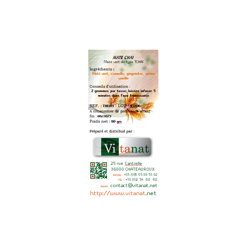 | Présentation | Maté vert aromatisé façon chaï indien |
