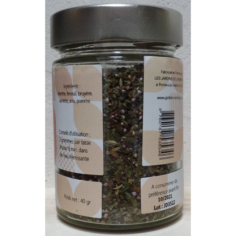 Composition | Ingrédients : Menthe, fenouil, bruyère, anis, sarriette, pomme |
