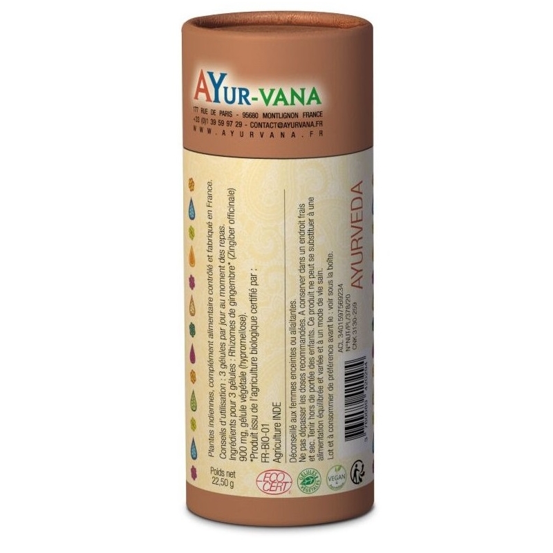 | Composition | INGRÉDIENTS par gélule : Rhizomes de gingembre dosé à 300 mg ; gélule végétale (hypromellose) Pilulier de 60 gélules |